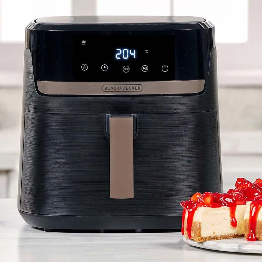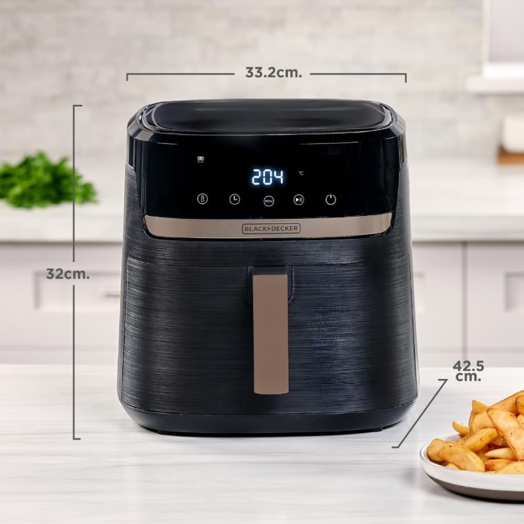 La Freidora de Aire Black + Decker AFBD82-1BDLA Purifry de 7 litros incluye 11 programas automáticos, pantalla táctil digital, temporizador de 60 minutos y cocción saludable con poco o nada de aceite. Compra online segura con entrega a todo Ecuador al mejor precio.