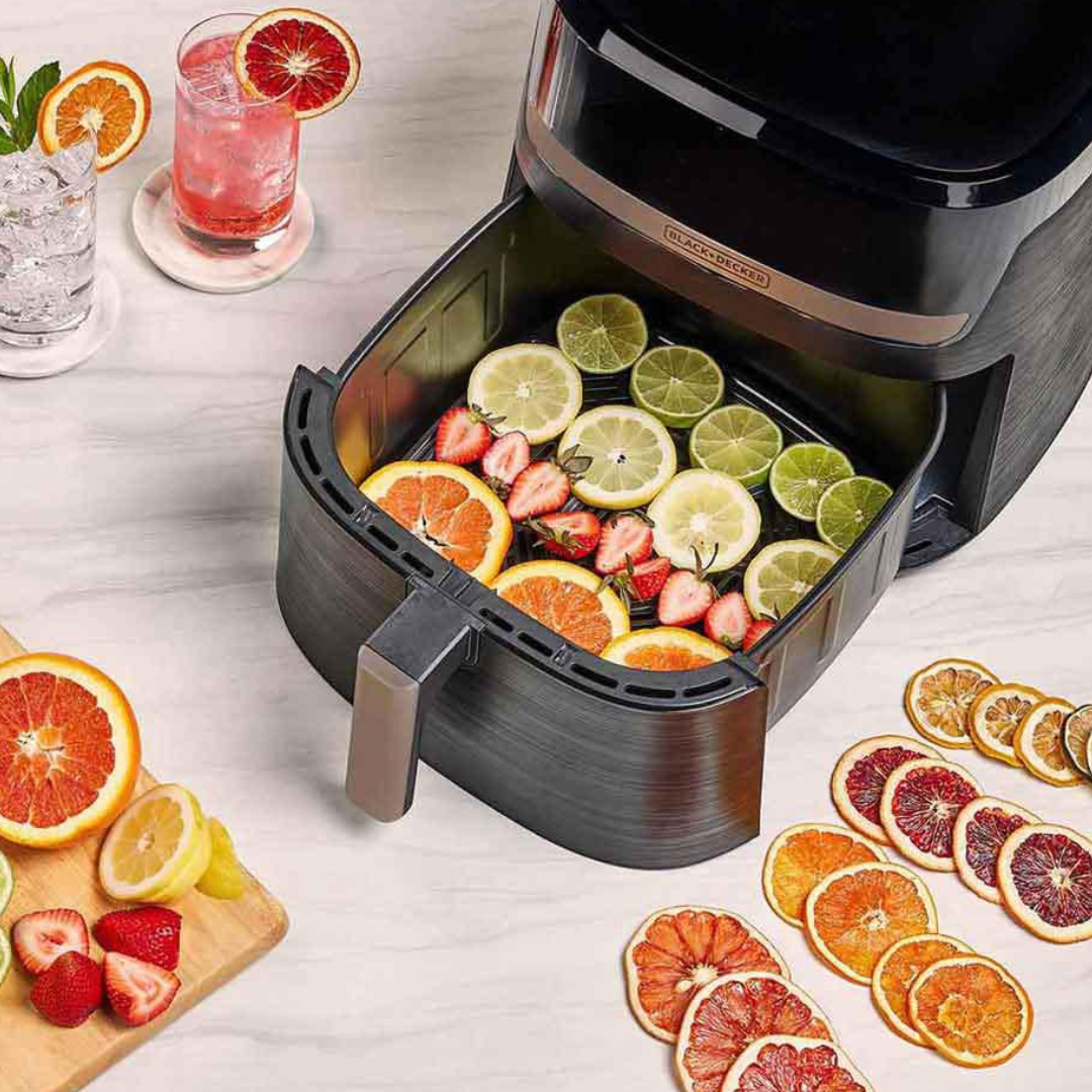 La Freidora de Aire Black + Decker AFBD82-1BDLA Purifry es la opción perfecta para familias grandes o quienes disfrutan cocinar en cantidades generosas. Su capacidad de 7 litros permite preparar pollos enteros, carnes, pescados, vegetales y mucho más en porciones abundantes y con resultados profesionales.