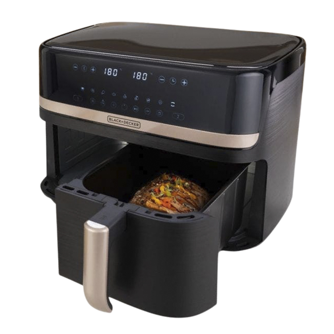 La Freidora de Aire Black + Decker AFBD92-1BDLA Purifry de 9 litros ofrece 12 programas automáticos, pantalla táctil digital y temporizador de 60 minutos. Cocina abundante y saludable con poco o nada de aceite. Compra segura con entrega en todo Ecuador.
